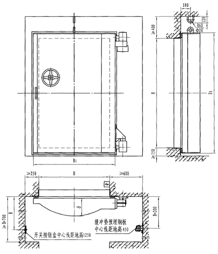 | 型號(hào) | 門孔寬B | 門孔高H | 門扇厚δ | B1 | H1 | 啟閉時(shí)間(s) |