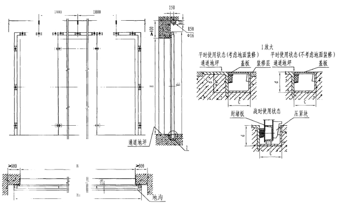 此封堵板可用于封堵平時使用、戰(zhàn)時不用的孔口。其特點是平時可以不安裝封堵板(但要加工好防在附近的指定位置),戰(zhàn)時根據(jù)事先設(shè)定的轉(zhuǎn)換時限將封堵板進(jìn)行快速安裝,以滿足防護(hù)、密閉的要求。根據(jù)其設(shè)置位置的不同可分為防護(hù)單元通風(fēng)口或連通口用雙向受力防護(hù)密閉封堵板(編號中無“L”)和臨空墻防護(hù)密閉封堵板兩大類。