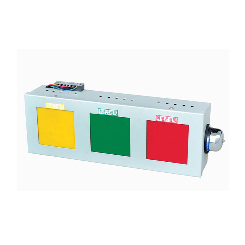 2、燈箱的結(jié)構(gòu):用于工程掩體內(nèi)部空氣質(zhì)量狀態(tài)的顯示和報(bào)警,主要對(duì)三種空氣質(zhì)量情況進(jìn)行報(bào)警:清潔、隔絕、濾毒。燈箱分別用三種顏色的燈光來(lái)對(duì)三種不用空氣情況報(bào)警:清潔——綠色燈光;隔絕——紅色燈光;濾毒——黃色燈光。