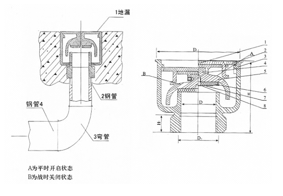 防爆地漏安裝于人防工程的排水管道處。平時地漏處于開啟狀態(tài),保證正常排水;戰(zhàn)時將地漏漏蓋下降,逆時針旋緊后封閉排水口,密閉時可防止爆炸沖擊波及其它有毒氣體由管道進入人防工程內(nèi)部,并可防止污水倒灌,起到安全防護作用。地漏漏體存水深度為30mm,能有效控制臭氣外溢。戰(zhàn)時該地段染毒需進行清洗時,將地漏打開,進行排水。